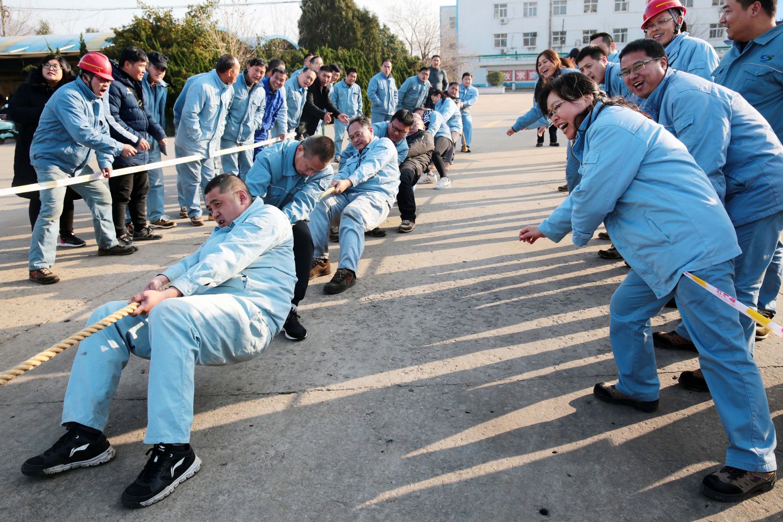 隨著(zhù)裁判的一聲哨響,各名選手緊握繩索,咬緊牙關(guān),一觸即發(fā),彎腰、下蹲、跨步,后仰、發(fā)力,整個(gè)動(dòng)作整齊劃一,一氣呵成。未參賽的員工自發(fā)組成啦啦隊為比賽隊員助威,加油聲、吶喊聲、喝彩聲,此起彼伏,飄蕩在公司上空。