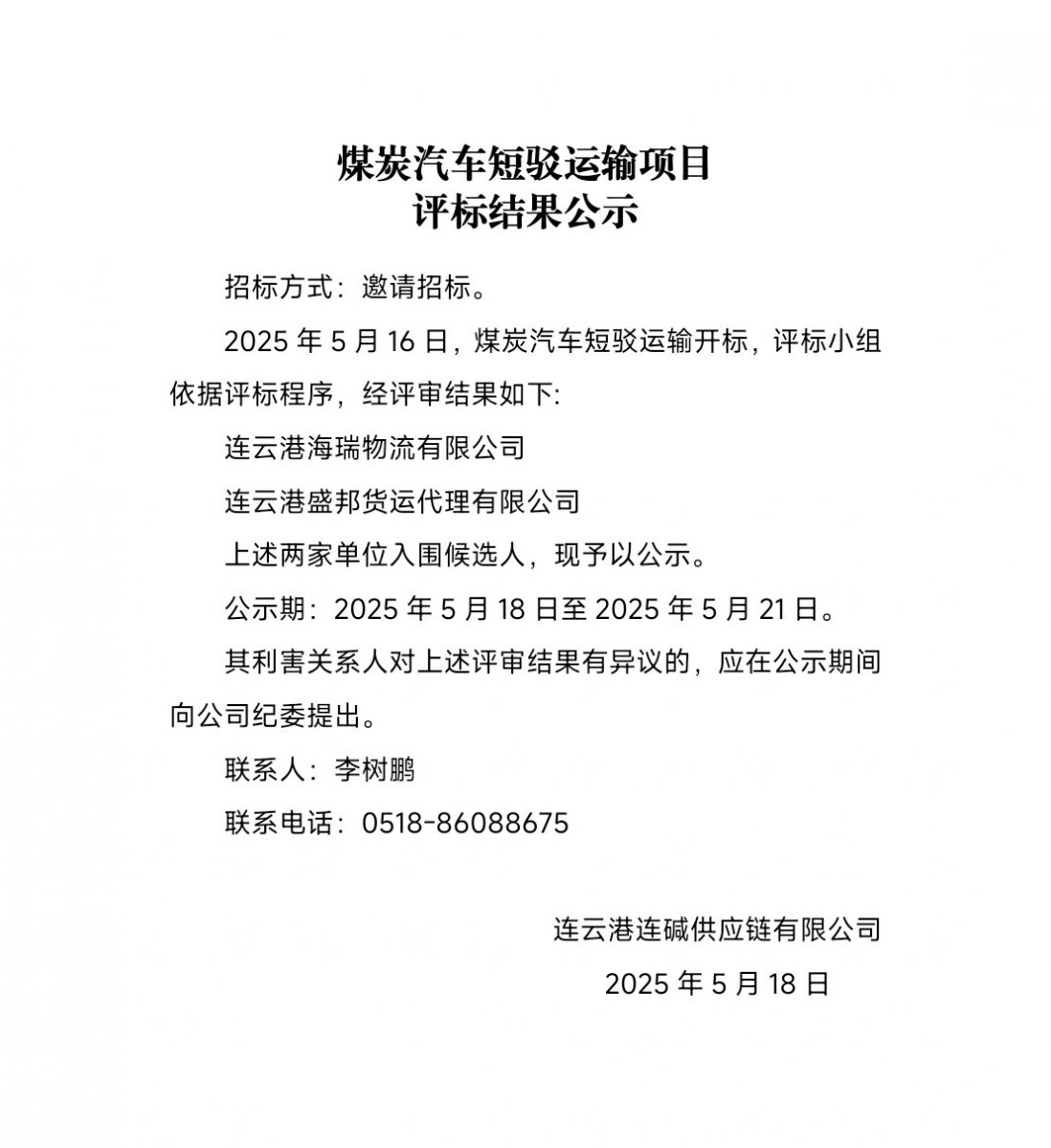 連云港連堿供應鏈有限公司煤炭汽車(chē)短駁運輸項目評標結果公示