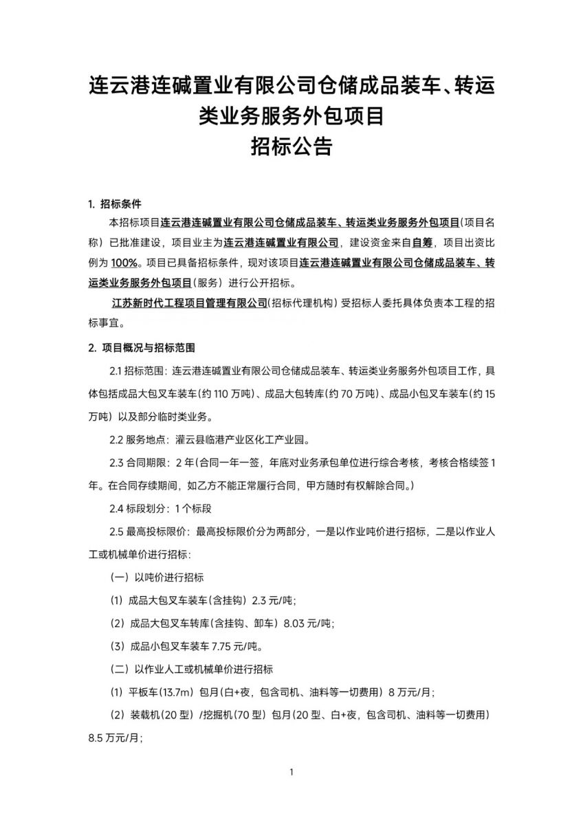 連云港連堿置業(yè)有限公司倉儲成品裝車(chē)、轉運類(lèi)業(yè)務(wù)服務(wù)外包項目招標公告