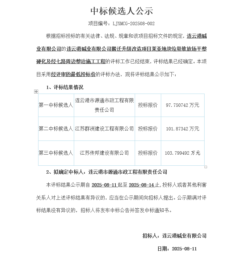 搬遷升級改造項目萊亞地塊垃圾堆放場(chǎng)平整硬化及經(jīng)七路周邊整治施工工程中標候選人公示