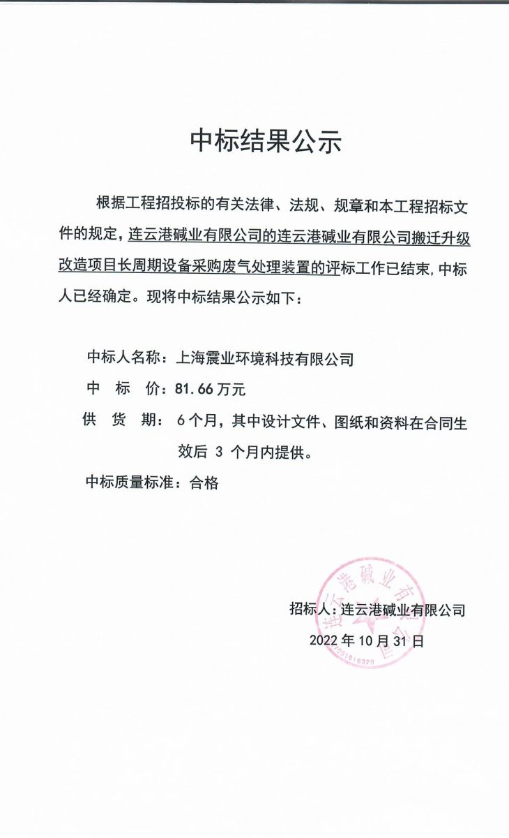 廢氣處理裝置中標結果公示