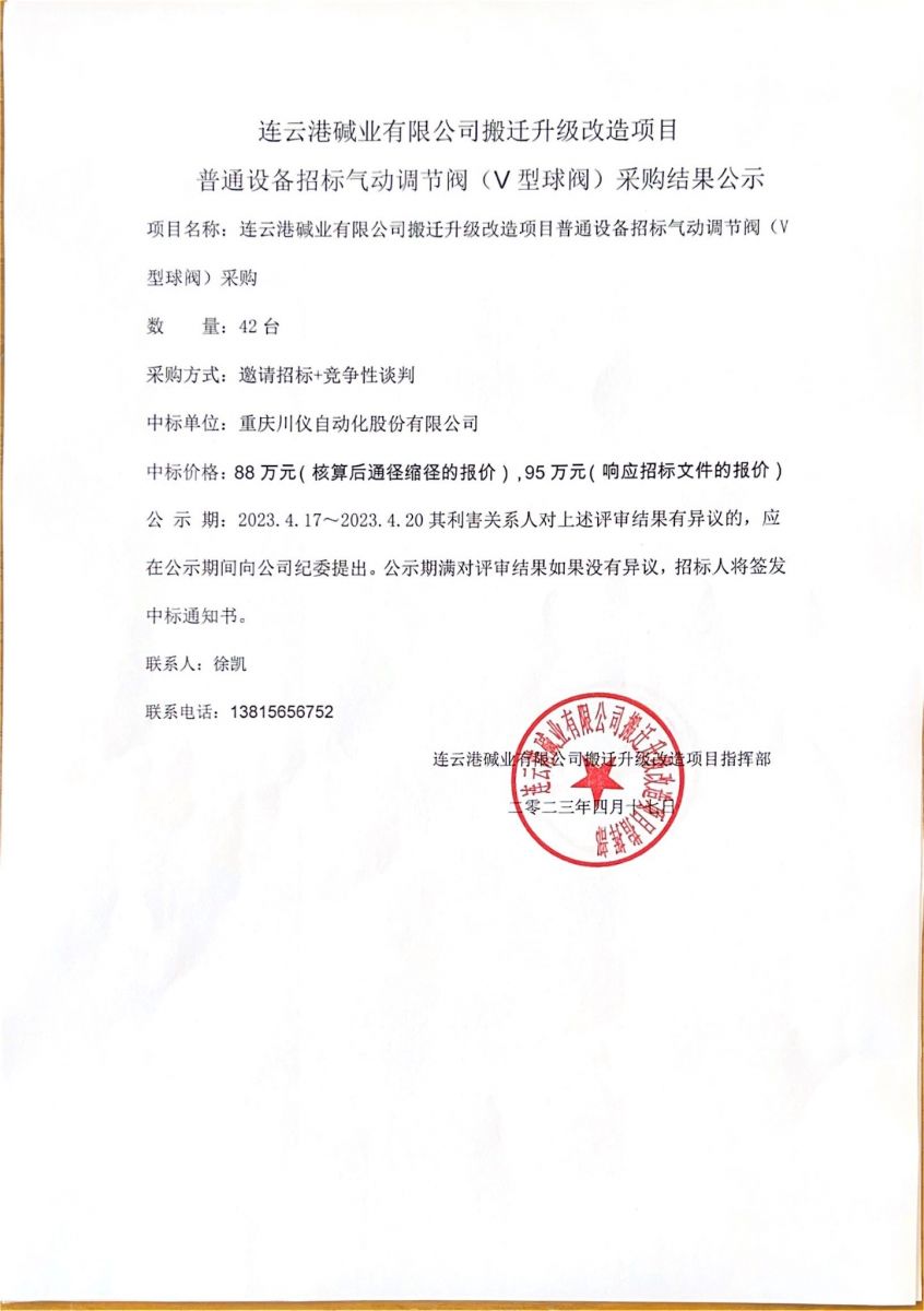 氣動(dòng)調節閥(V型球閥)采購結果公示