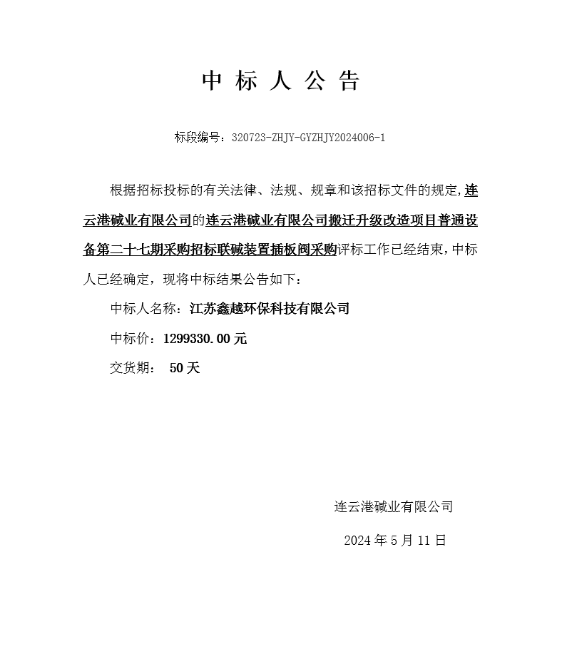 搬遷升級改造項目普通設備第二十七期采購招標聯(lián)堿裝置插板閥采購中標人公告