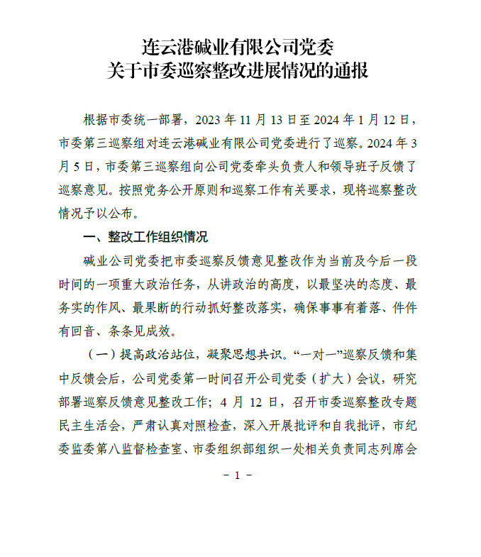 連云港堿業(yè)有限公司黨委關(guān)于市委巡察整改進(jìn)展情況的通報