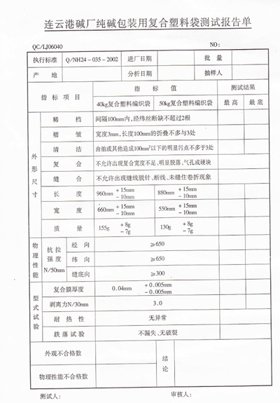 5.6 其他主要資格要求:具有合法有效的生產(chǎn)許可資質(zhì),企業(yè)制度完善、質(zhì)量管理規范,具有完整的拉絲、織布、縫紉、檢測等生產(chǎn)線(xiàn),注冊資金不少于500萬(wàn)元(人民幣)。食品包裝袋投標人應具備食用包裝物生產(chǎn)許可資質(zhì),并提供第三方檢測報告。投標人必須送樣品袋先經(jīng)我公司質(zhì)檢部門(mén)檢測合格(2018年10月20日之前送到連云港堿業(yè)有限公司供應部,原招標人供應商不需送樣品袋)。符合法律、法規規定的其他條件。