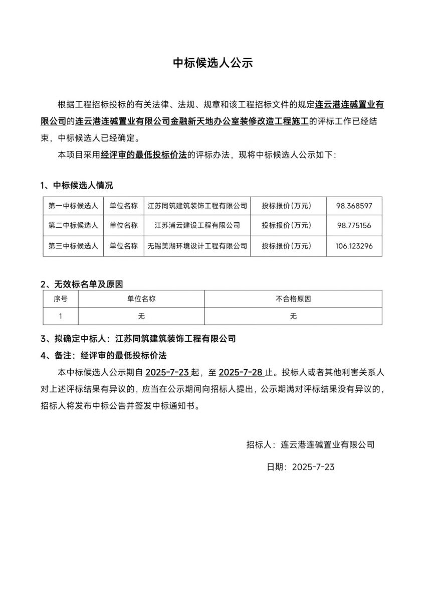 連云港連堿置業(yè)有限公司金融新天地辦公室裝修改造工程施工中標候選人公示