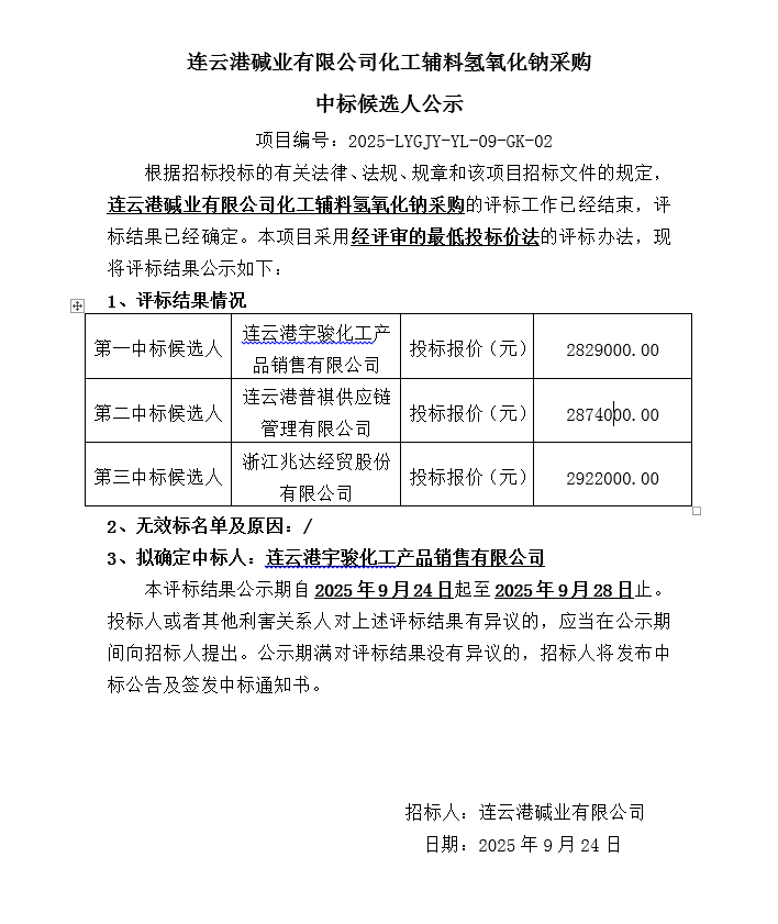連云港堿業(yè)有限公司化工輔料氫氧化鈉采購中標候選人公示
