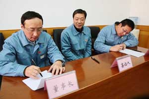 會(huì )上還宣讀了《關(guān)于表彰2017年度HSE先進(jìn)單位和個(gè)人的決定》,公司董事長(cháng)代表公司與重堿車(chē)間、煅燒車(chē)間等5家部門(mén)代表簽訂了2018年HSE責任書(shū)。