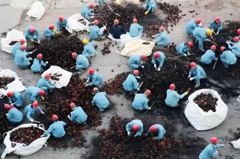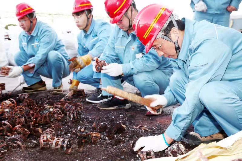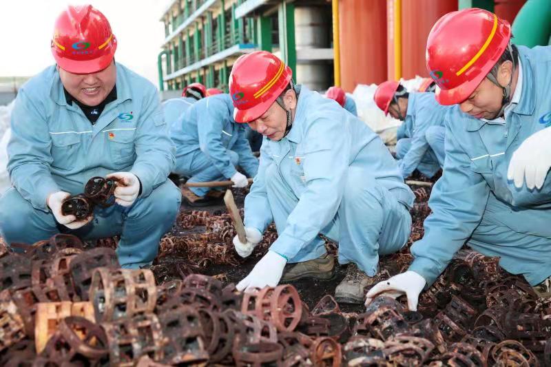 勞動(dòng)現場(chǎng),大家有的用木棍敲打填料,有的裝填包裝袋,有的將裝袋的填料擺放整齊……一個(gè)個(gè)忙得不亦樂(lè )乎。三個(gè)多小時(shí)終于完成了所有填料的清理工作,不僅解決了基層的困難,為蒸餾塔的檢修節約了時(shí)間,并且共回收可用填料25立方,為企業(yè)節約了一筆可觀(guān)的費用。