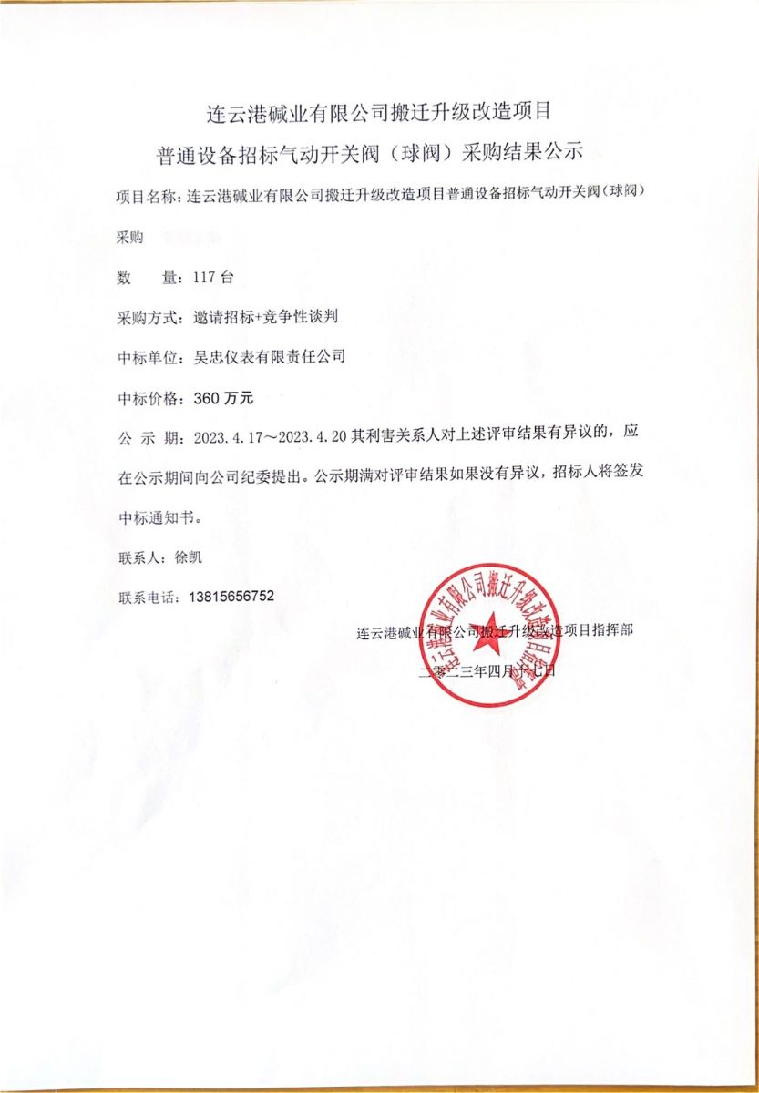 氣動(dòng)開(kāi)關(guān)閥(球閥)采購結果公示
